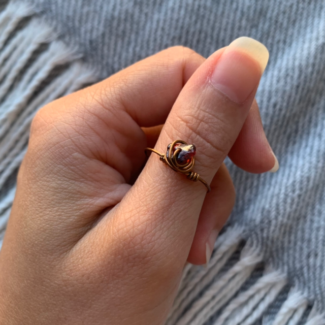 Bague en cuivre réalisée à la main dans mon atelier, et ornée d’une pierre naturelle de Grenat.
