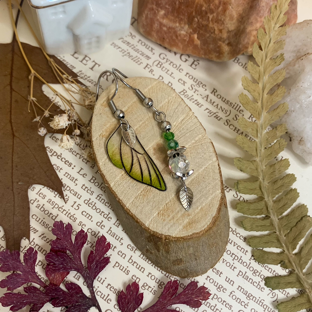 Chaque paire est unique, non reproductible, composée de perles de verre irisées et d'une Fée enchanteresse.