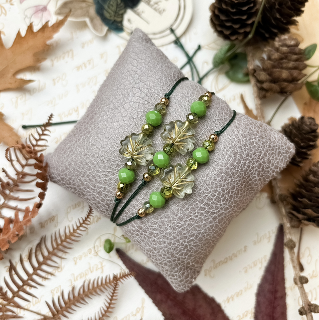 De fines feuilles d’érable vertes se mêlent à des perles de verre facettées et irisées, aux reflets lumineux. Un bijou chic et enchanteur, parfait pour accueillir la saison cosy avec élégance. Pour un joli poignet de Fée toute l'année !