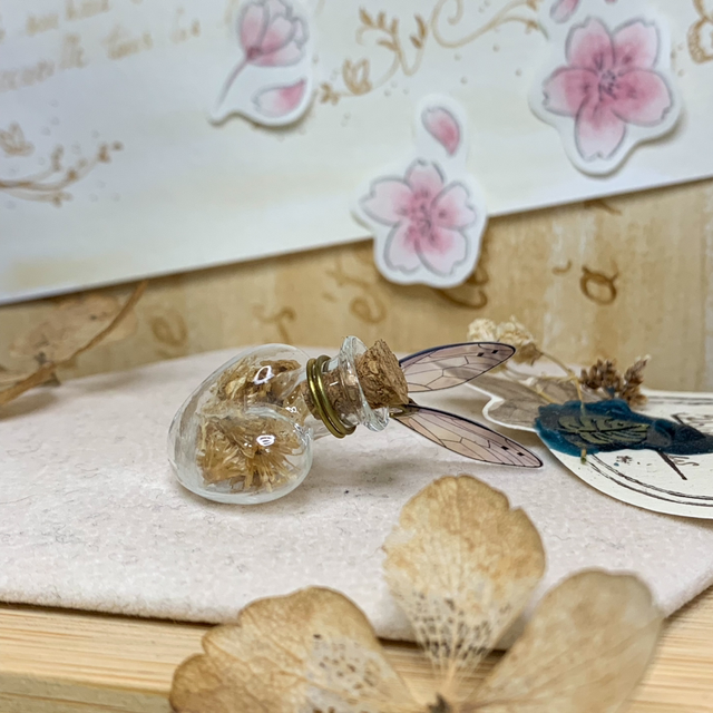 Depuis 2017 dans les rayons de la boutique du Bois des Fées, parmi les potions et les ingrédients magiques posés sur les étagères, se trouvent ces jolies fioles féeriques : de petites merveilles emplies de végétaux ou autres trésors glanés dans mes balades, et surmontées d'Ailes de Fées. Ces fioles ne sont pas seulement de simples objets de décoration, mais renferment également les secrets magiques de chaque lieu de récolte.