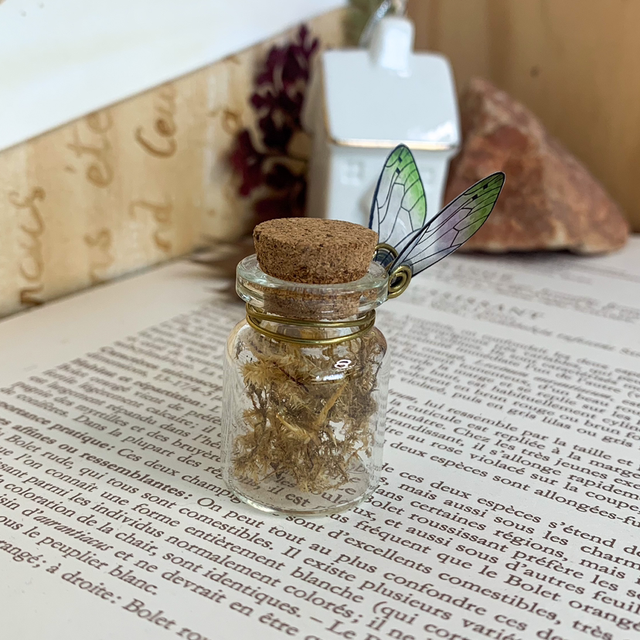 Depuis 2017 dans les rayons de la boutique du Bois des Fées, parmi les potions et les ingrédients magiques posés sur les étagères, se trouvent ces jolies fioles féeriques : de petites merveilles emplies de végétaux ou autres trésors glanés dans mes balades, et surmontées d'Ailes de Fées. Ces fioles ne sont pas seulement de simples objets de décoration, mais renferment également les secrets magiques de chaque lieu de récolte.