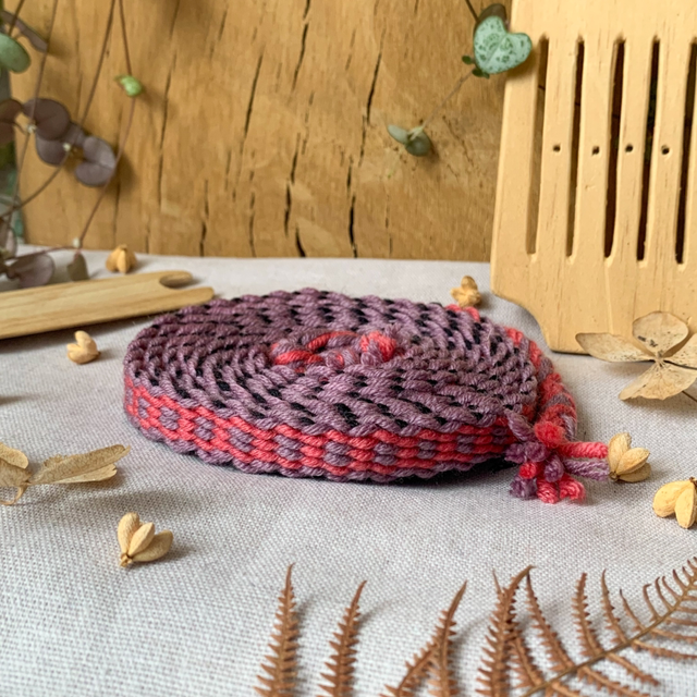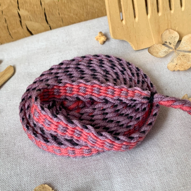 Ce galon tissé est composé de fils de laine 100% mérinos, il mesure 1m60.