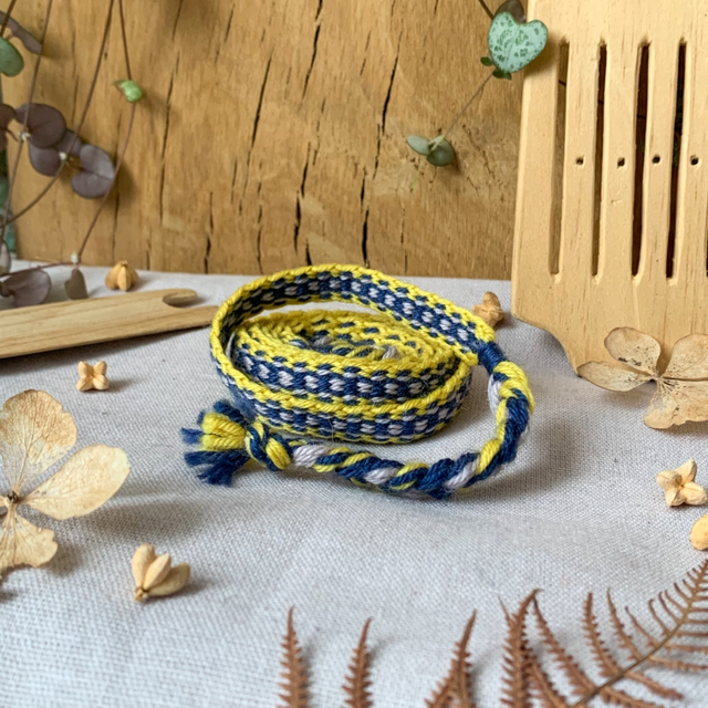 Ce galon tissé est composé de fils de laine 100% mérinos, il mesure 1m06.