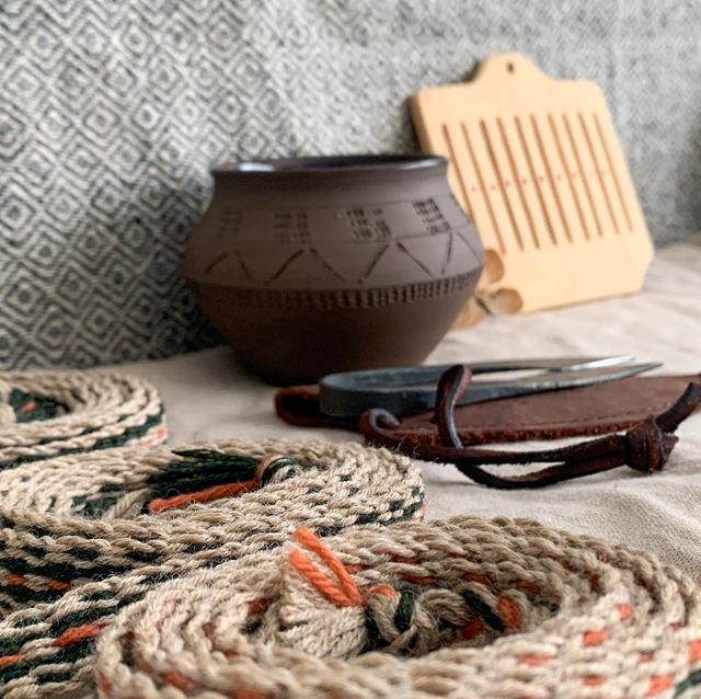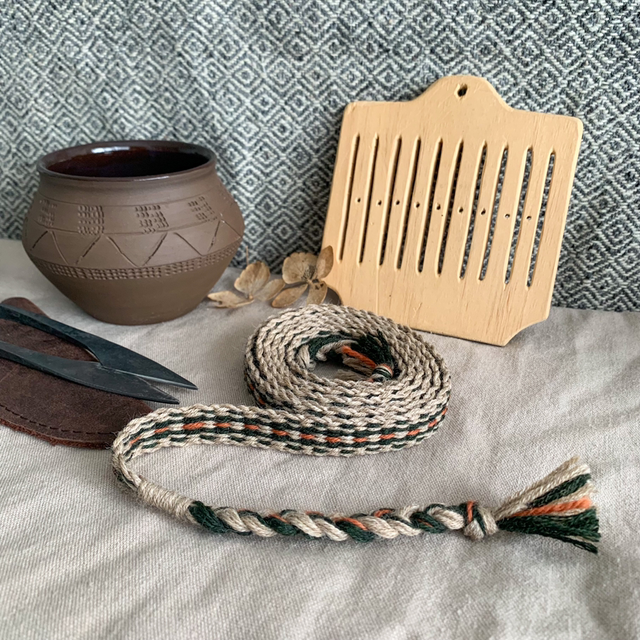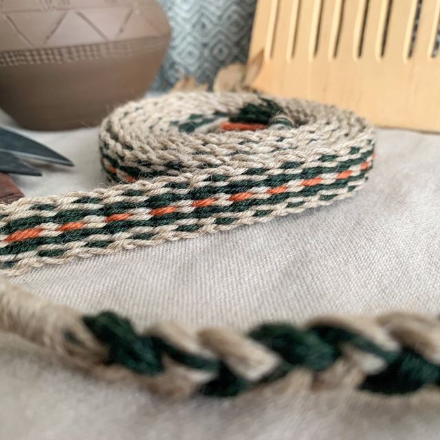 Ce galon tissé est composé de fils de laine 100% mérinos sans mulesing, et de laine orange filée et tissée à la main teinte à la garance, il mesure 1m75.