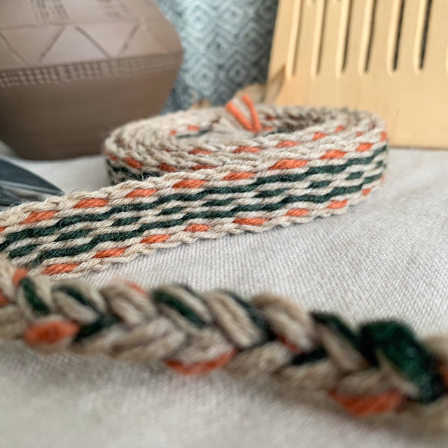Ce galon tissé est composé de fils de laine 100% mérinos sans mulesing, et de laine orange filée et tissée à la main teinte à la garance, il mesure 1m60.