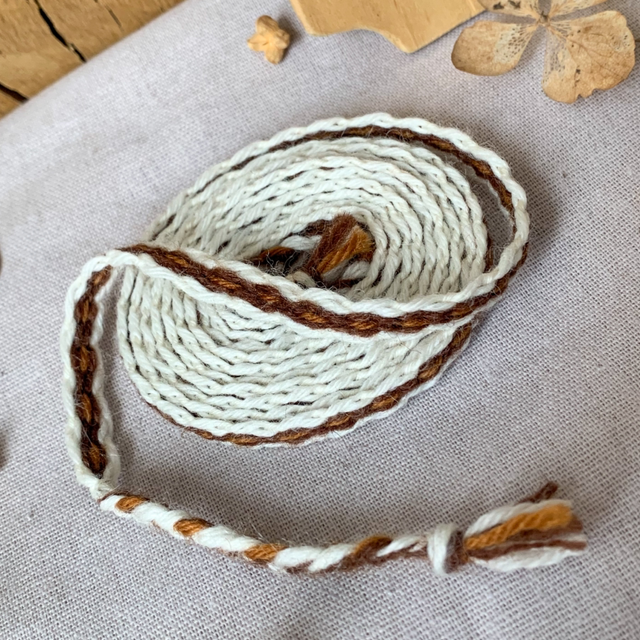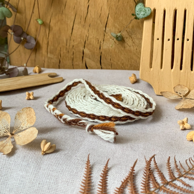 Ce galon tissé est composé de fils de laine 100% mérinos, filés et tissés main, teinture naturelle avec de la noix, il mesure 1m85.