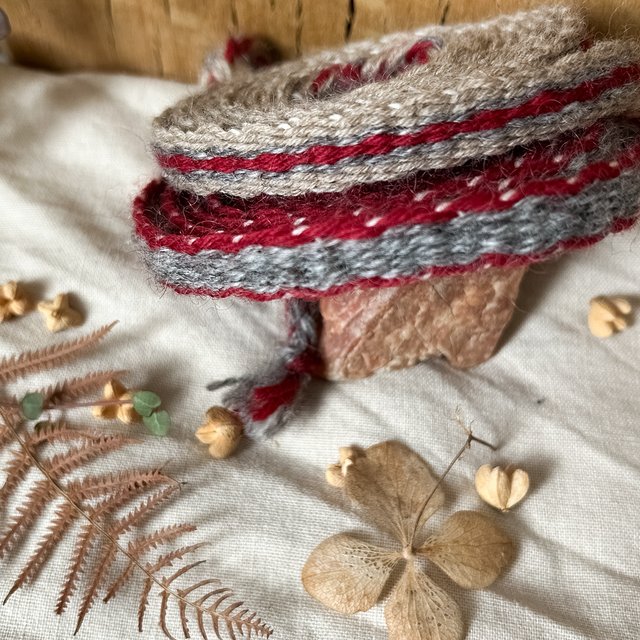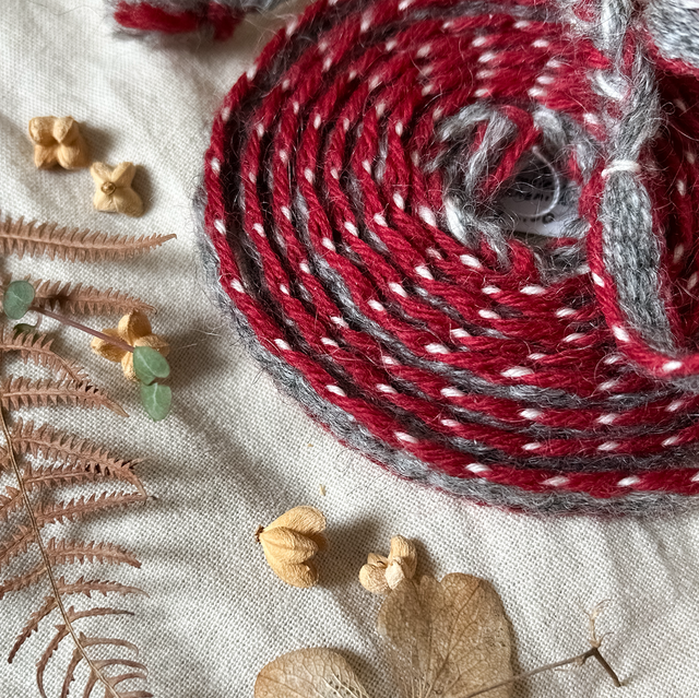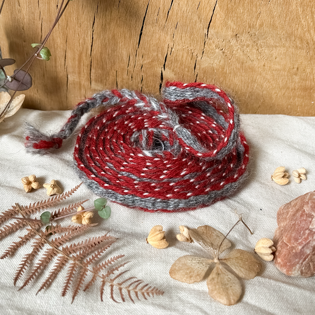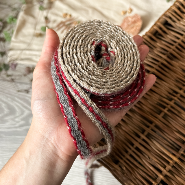 Ce galon tissé est composé de fils de laine 100% mérinos, filés et tissés main, teinture naturelle avec de la cochenille, il mesure 2m00.