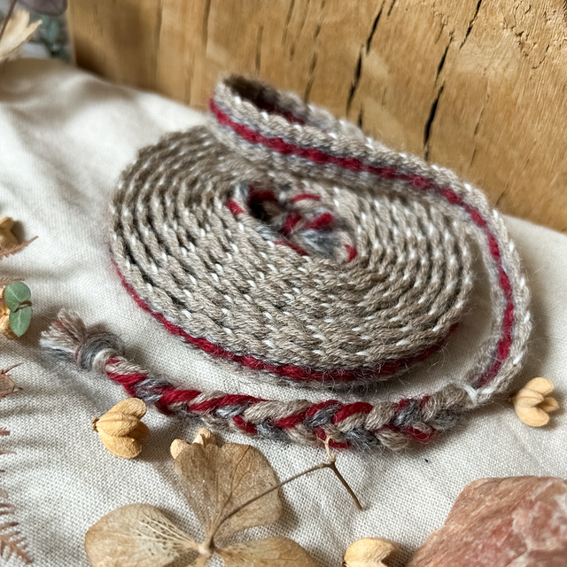 Ce galon tissé est composé de fils de laine 100% mérinos, filés et tissés main, teinture naturelle avec de la cochenille, il mesure 1m98.