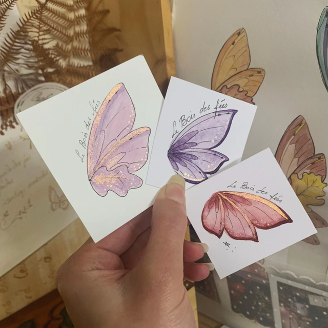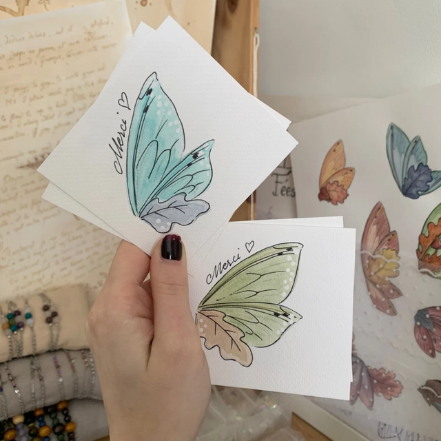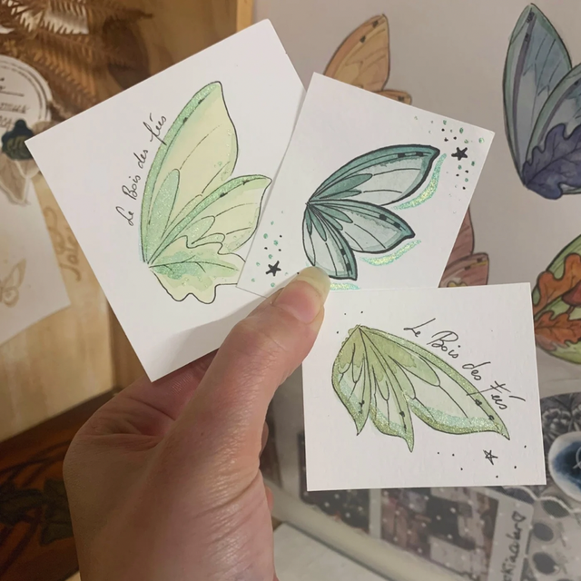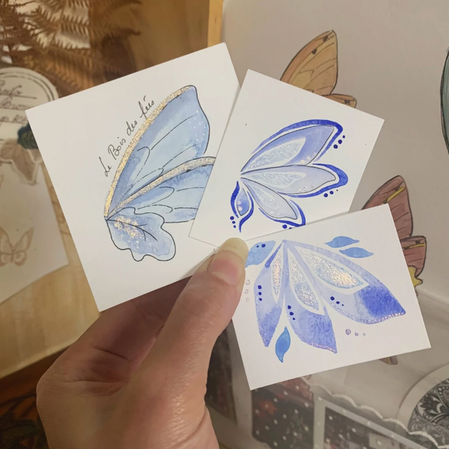 J’utilise des aquarelles artisanales aux couleurs mates, scintillantes ou dissociées, offrant des rendus incroyablement magiques qui capturent toute la poésie de mon univers féérique.