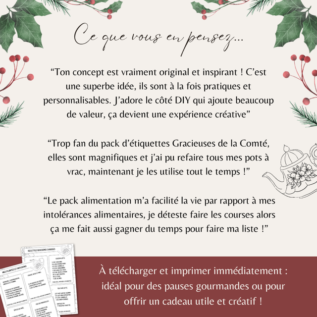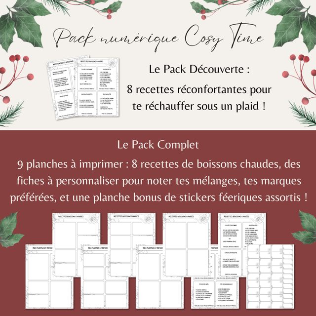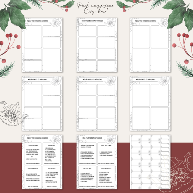 Complet : 9 planches à imprimer : 8 recettes de boissons chaudes, des fiches à personnaliser pour noter tes mélanges, tes marques préférées, et une planche bonus de stickers féeriques assortis !