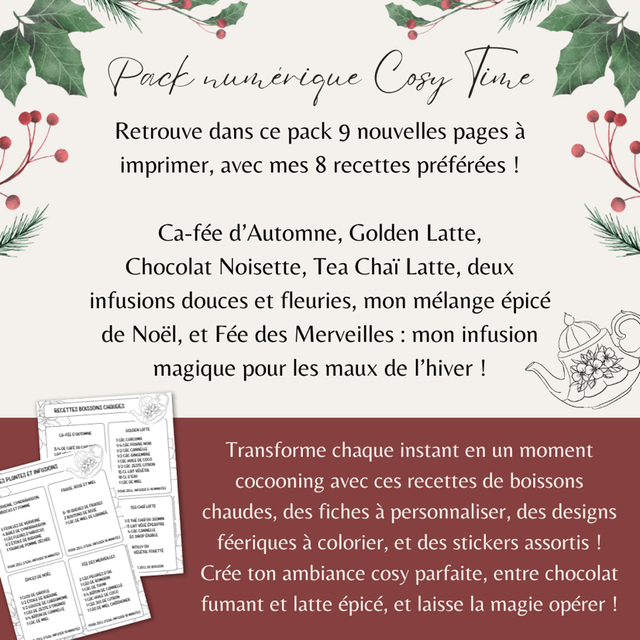 Transforme chaque instant en un moment cocooning avec ces recettes de boissons chaudes, des fiches à personnaliser, des designs féeriques à colorier, et des stickers assortis ! Crée ton ambiance cosy parfaite, entre chocolat fumant et latte épicé, et laisse la magie opérer !